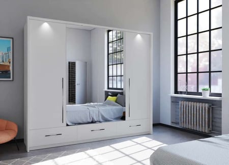 Overall, the white 255 TOLEDO wardrobe with bi-folding doors, mirrored doors, 6 shelves, 2 rails, 3 drawers, and LED lights is a practical and stylish storage solution for your clothing and other belongings. Its sleek design, versatile storage options, and thoughtful features make it a valuable addition to any bedroom or dressing area.