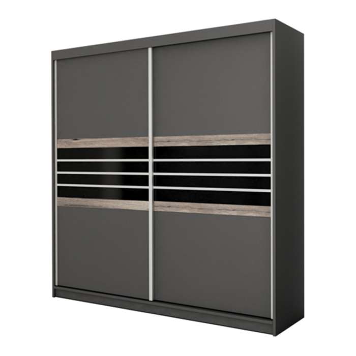 The TURYN Wardrobe (203cm) in lava (brown/grey) with black glass panels has 2 sliding doors, 8 shelves, and 2 hanging rails, offering stylish and spacious storage.