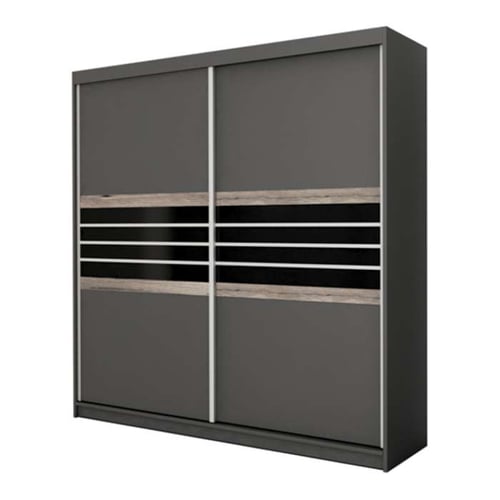 The TURYN Wardrobe (203cm) in lava (brown/grey) with black glass adds contemporary elegance to any space. Featuring 2 sliding doors, each adorned with 4 sleek black glass horizontal panels at the centre, it blends style and functionality seamlessly. The slimline handles enhance its modern design, while the durable 16mm laminated chipboard construction ensures quality and longevity. Perfect for those seeking a chic and practical storage solution.
