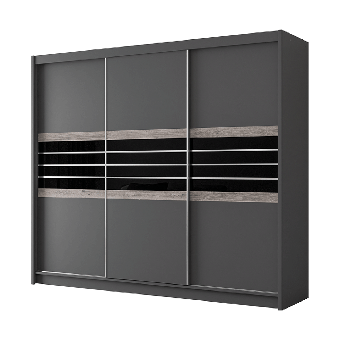 The TURYN Wardrobe (250cm) in lava (brown / grey)with black glass adds contemporary elegance to any space. Featuring 3 sliding doors, each adorned with 4 sleek black glass horizontal panels at the centre, it blends style and functionality seamlessly. The slimline handles enhance its modern design, while the durable 16mm laminated chipboard construction ensures quality and longevity. Perfect for those seeking a chic and practical storage solution.
