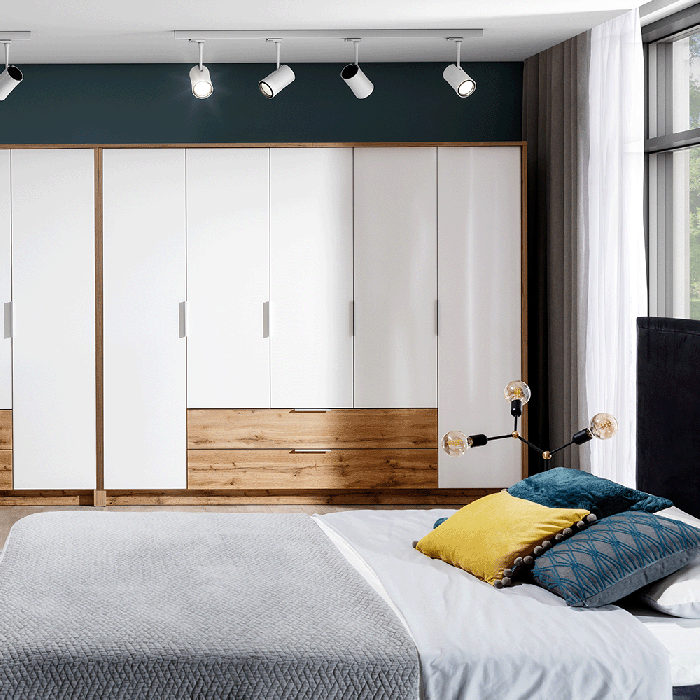 Crafted from durable 16mm laminated chipboard, the VIENNA 255 wardrobe is designed with four hinged doors featuring sleek aluminium handles, seamlessly blending modern aesthetics with practical functionality. The harmonious combination of oak wotan and white finishes enhances its visual appeal, while the high-quality materials and thoughtful design make it a versatile addition to any contemporary interior.