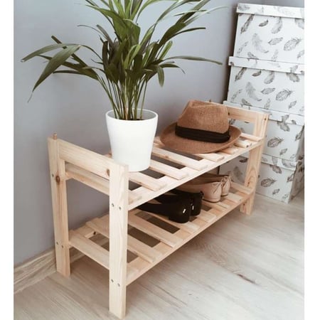 Our wooden shoe rack is sturdy and practical. With 2 shelves it has room to hold up to 6 pairs of shoes. Not only is it perfect for storing shoes, it can also work great in your bathroom for storing towels on.